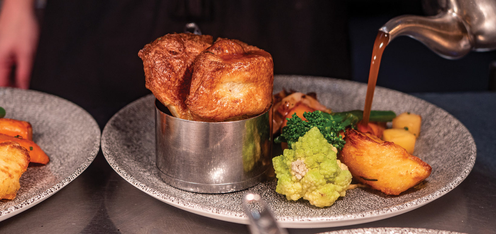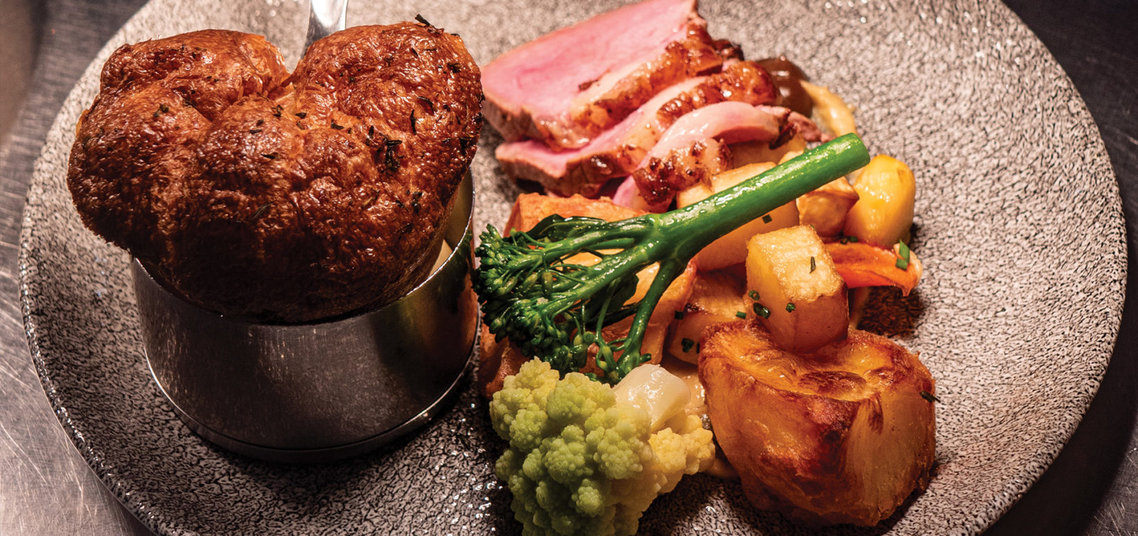 Slow roast Scotch beef, Yorkshire puddings, roast potatoes, maple thyme glazed carrots, jugs of beef gravy